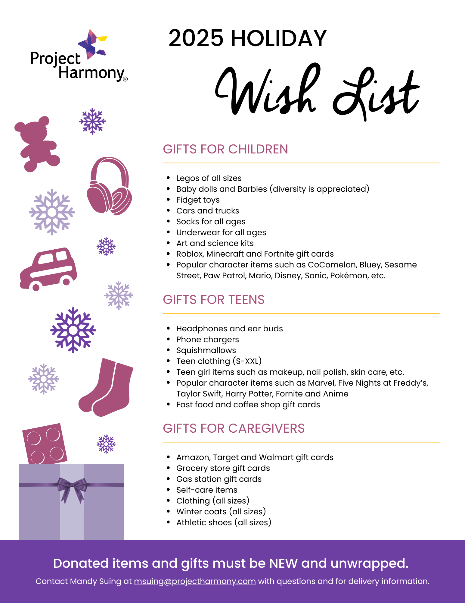 At this time, donations can be shipped directly to us or dropped off by appointment only. Email Mandy Suing at msuing@projectharmony.com to schedule a drop off time, to confirm you sent a package, or with any additional questions regarding Wish List donations.